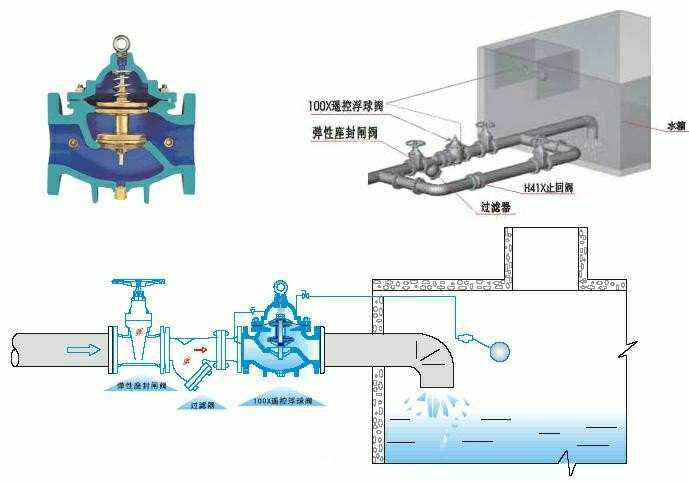 100X遥控浮球阀由主阀、针阀、球阀、浮球阀、微型过滤器等组成水力控制接管系统,调定后,自动控制液面高度。