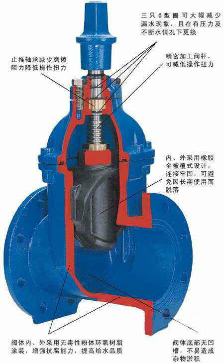 3.可靠的卫生性环氧树脂符合卫生标准GB/T17219-1998,闸板整体包覆符合卫生检验的橡胶;阀杆、阀杆螺母等零件采用不受水腐蚀的不锈钢或青铜等到材料。